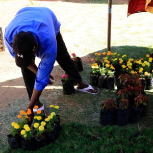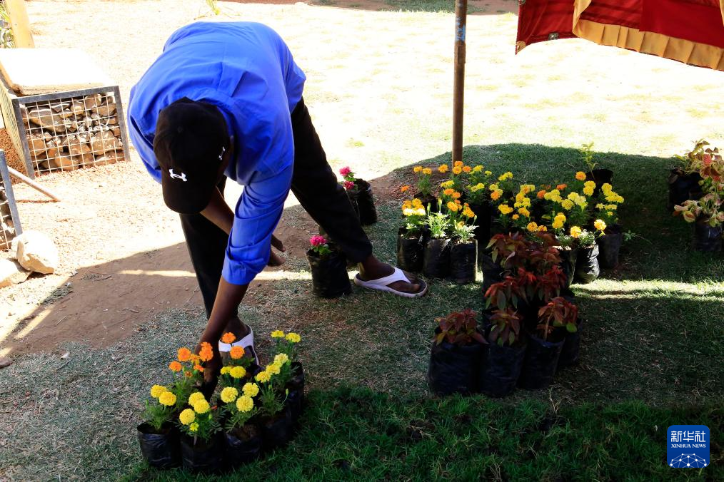 2月7日,在苏丹首都喀土穆,一位参展商在花卉节上整理花卉幼苗。