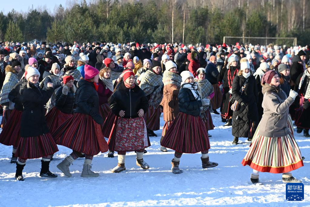 2月7日,在爱沙尼亚东北部小镇科赫特拉-诺梅,人们身着民族服装参加冬季舞蹈节。