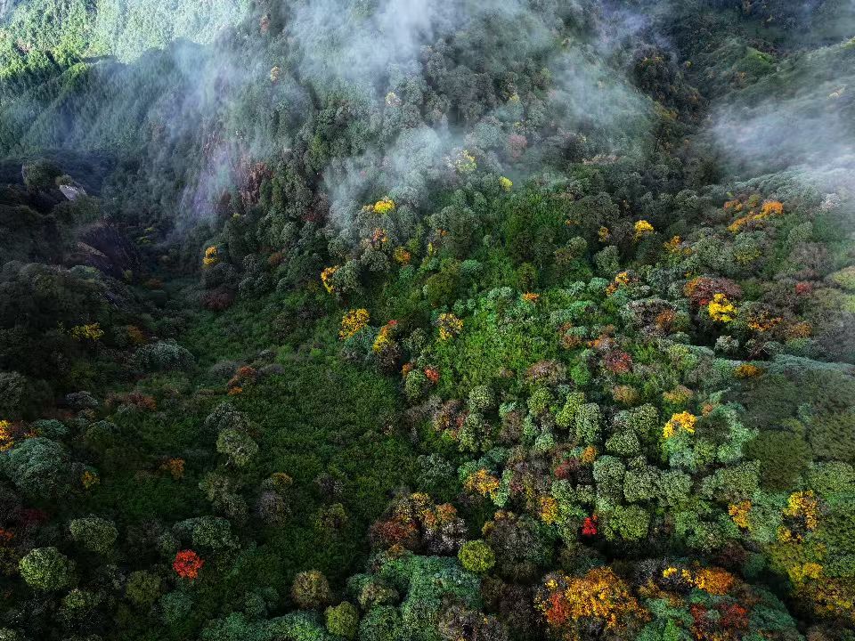初冬時節(jié),走進云南省騰沖市猴橋鎮(zhèn)輪馬村粉竹壩,層林盡染,五彩斑斕,彩色山林如巨幅油畫鋪展于群山之間。薄霧繚繞中,山林靜謐而幽遠,構(gòu)成一幅濃墨重彩的冬日畫卷。
