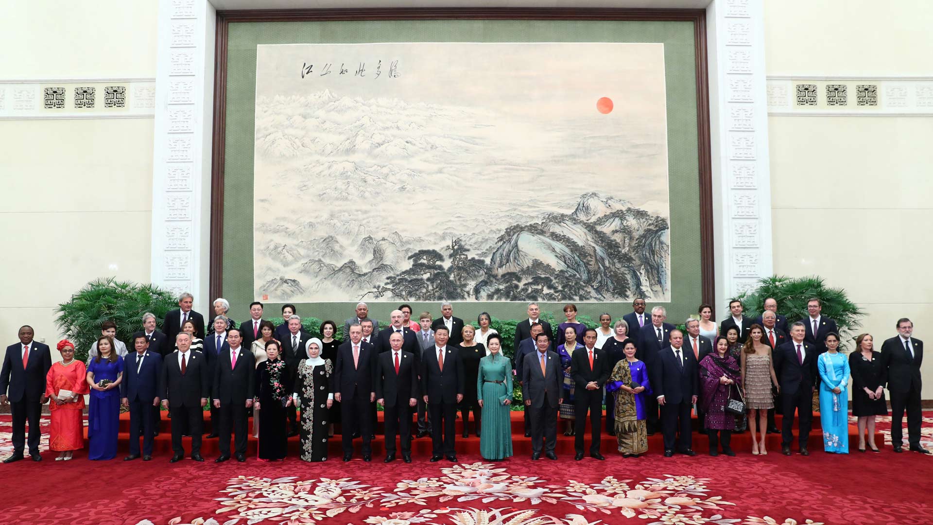 5月14日,國家主席習近平在北京人民大會堂舉行宴會,歡迎出席“一帶一路”國際合作高峰論壇的外方代表團團長及嘉賓。這是習近平和夫人彭麗媛同外方代表團團長及配偶集體合影留念。新華社記者 謝環(huán)馳 攝