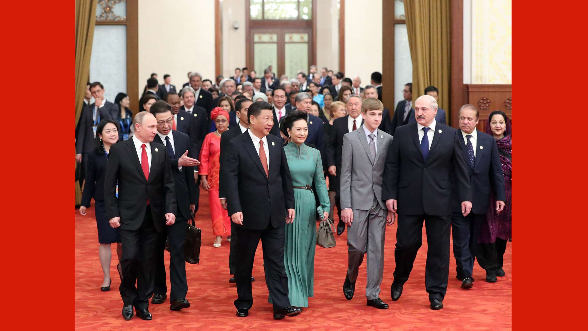 5月14日,國家主席習近平在北京人民大會堂舉行宴會,歡迎出席“一帶一路”國際合作高峰論壇的外方代表團團長及嘉賓。這是習近平和夫人彭麗媛同貴賓們一同步入宴會廳。新華社記者 劉衛(wèi)兵 攝