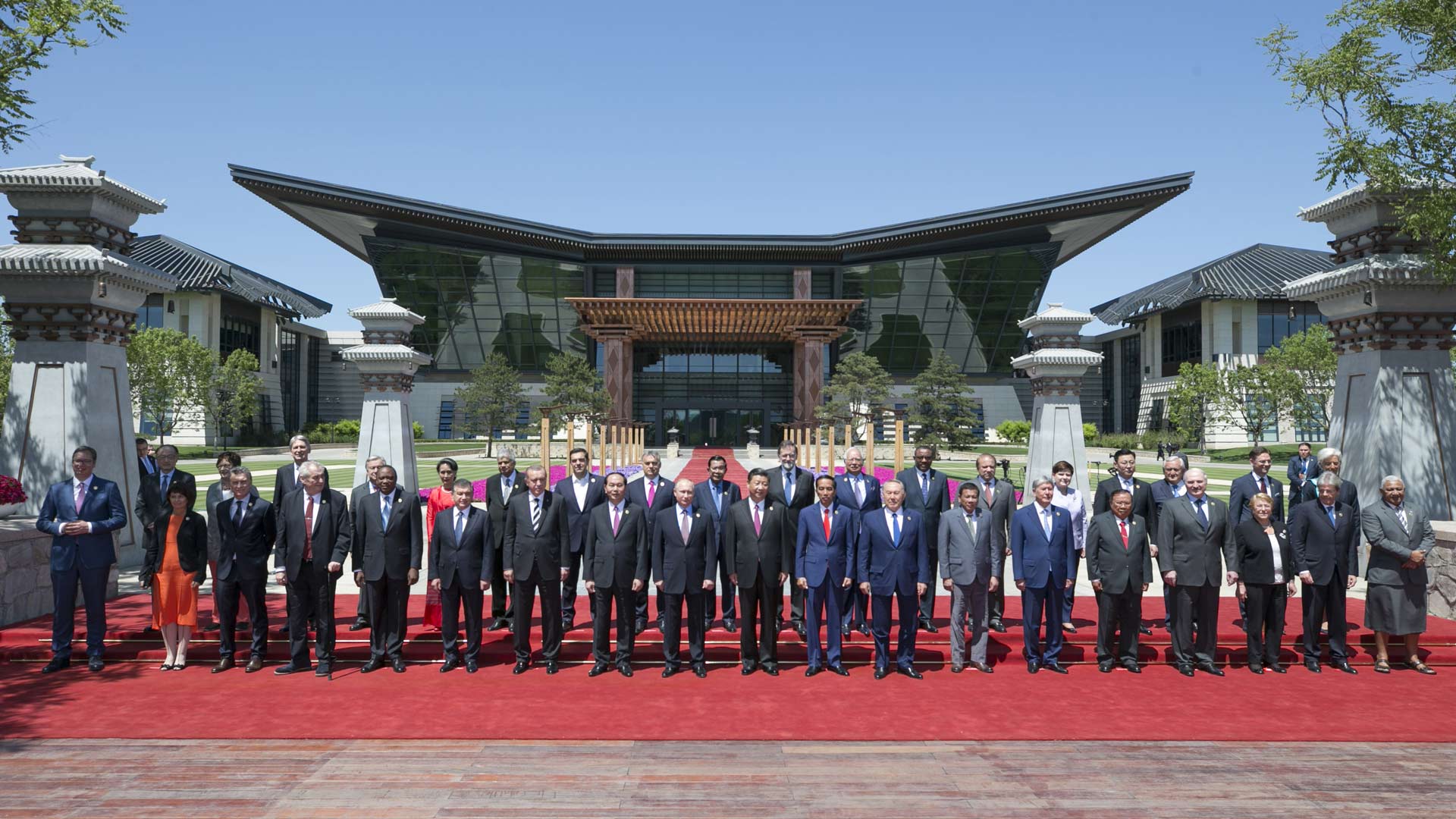 5月15日,“一帶一路”國際合作高峰論壇圓桌峰會在北京雁棲湖國際會議中心舉行,國家主席習近平主持會議并致開幕辭。這是第一階段會議結(jié)束后,習近平同外方代表團團長及嘉賓在雁棲湖國際會議中心前合影。新華社記者 姚大偉 攝