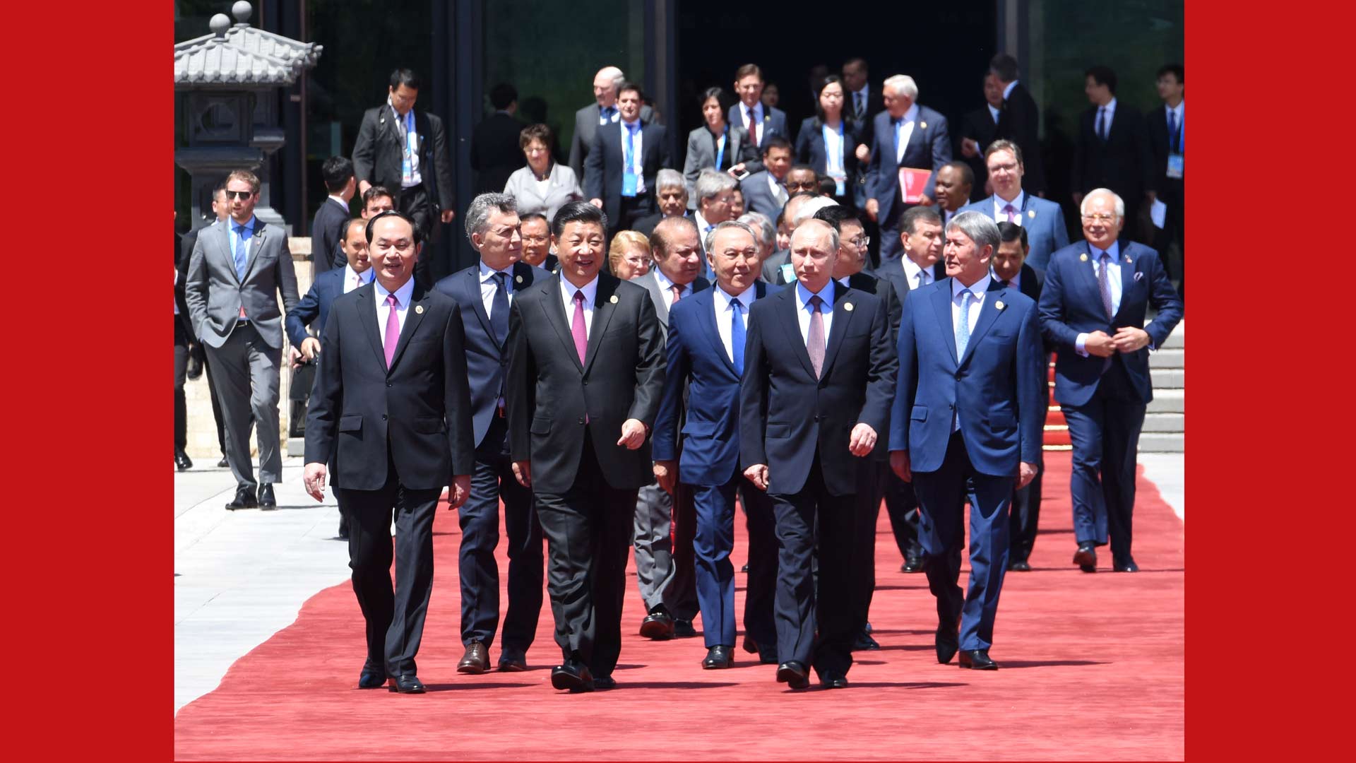 5月15日,“一帶一路”國際合作高峰論壇圓桌峰會在北京雁棲湖國際會議中心舉行,國家主席習近平主持會議并致開幕辭。這是第一階段會議結(jié)束后,習近平同外方代表團團長及嘉賓步出雁棲湖國際會議中心。新華社記者 饒愛民 攝