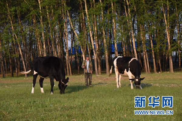 6月14日,黑龍江省龍江縣哈拉海鄉(xiāng)西里村貧困戶龍雙山趕著牛吃草。新華社記者 王建 攝