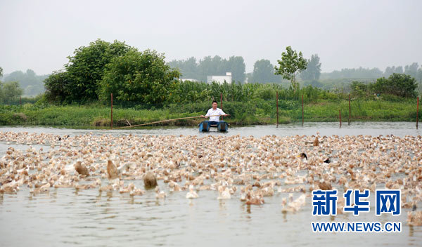 6月14日,在河南省信陽市光山縣文殊鄉(xiāng)杜槐村麻鴨養(yǎng)殖基地,甘平安正在放養(yǎng)麻鴨。新華社發(fā)
