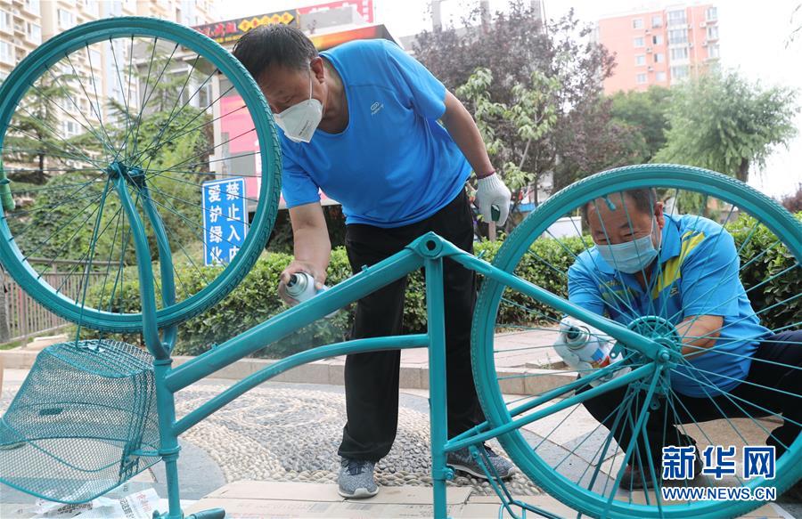 6月9日,豐臺(tái)區(qū)花鄉(xiāng)天倫錦城社區(qū)居民們?cè)诮o廢舊自行車噴漆。