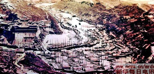 ▲晚清時(shí)期在自貢釜溪河邊等待運(yùn)送井鹽的船隊(duì)的照片。新華社資料片