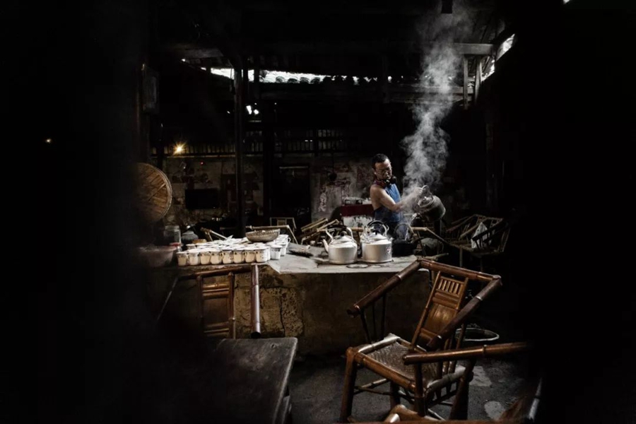 5月17日,四川成都。早晨,茶館工作人員開始倒水。作者:王金磊