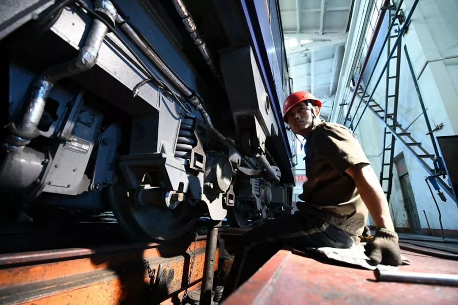 10月2日,內(nèi)蒙古巴林右旗。當?shù)罔F路職工為機車更換車輪。作者:這么近那么遠