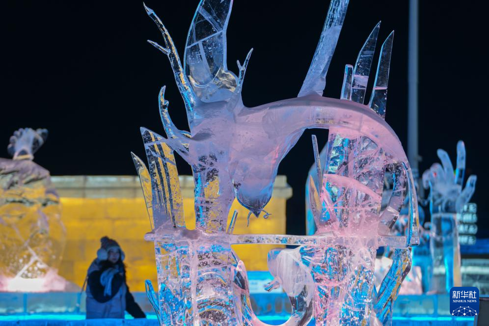 近日,一批冰雕新作在哈尔滨冰雪大世界亮相,与第37届中国·哈尔滨国际冰雕比赛作品及园区原有冰雕遥相辉映,共同点亮北国冬夜。