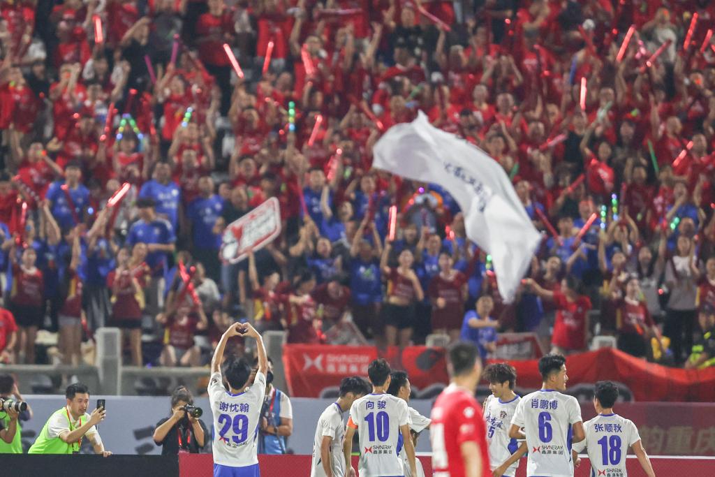 9月13日,2025重庆市足球超级联赛在重庆市渝中区大田湾体育场开赛。在中心城区赛区首轮比赛中,九龙鑫源熊猫队3比2战胜渝中半岛队。图为九龙鑫源熊猫队球员在进球后与观众互动。新华社记者 黄伟 摄