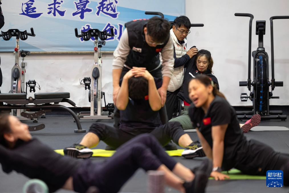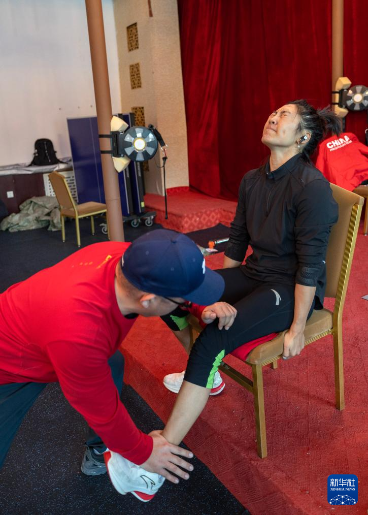 队员们的日常训练通常从清晨开始,天光初亮,他们已经在宾馆的走廊、会议室甚至电梯间门口开始拉伸和热身训练。简单的早饭后,他们会来到雪场顶着寒风反复起跳、旋转、落地,专注打磨每一个动作细节。三个小时的空中动作技术训练结束后,队员们在下午来到宾馆附近由食堂改造成的临时体能训练馆进行体能、力量训练。体能教练根据每个队员的身体状态科学安排训练强度和项目,确保他们在完成核心力量、爆发力及柔韧性等训练的同时保持良好状态。晚饭后,队员们相继走进由宾馆房间临时改造的恢复区,随队医生、康复师将为他们进行理疗、按摩,帮助他们恢复体能。