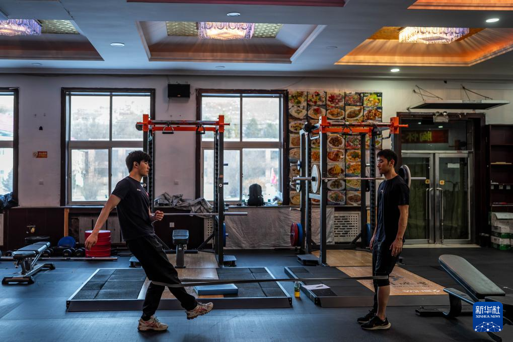 11月6日,在食堂改造而成的临时体能训练馆里,自由式滑雪空中技巧国家集训队队员齐广璞(右)和队友孙佳旭在进行体能和力量训练。
