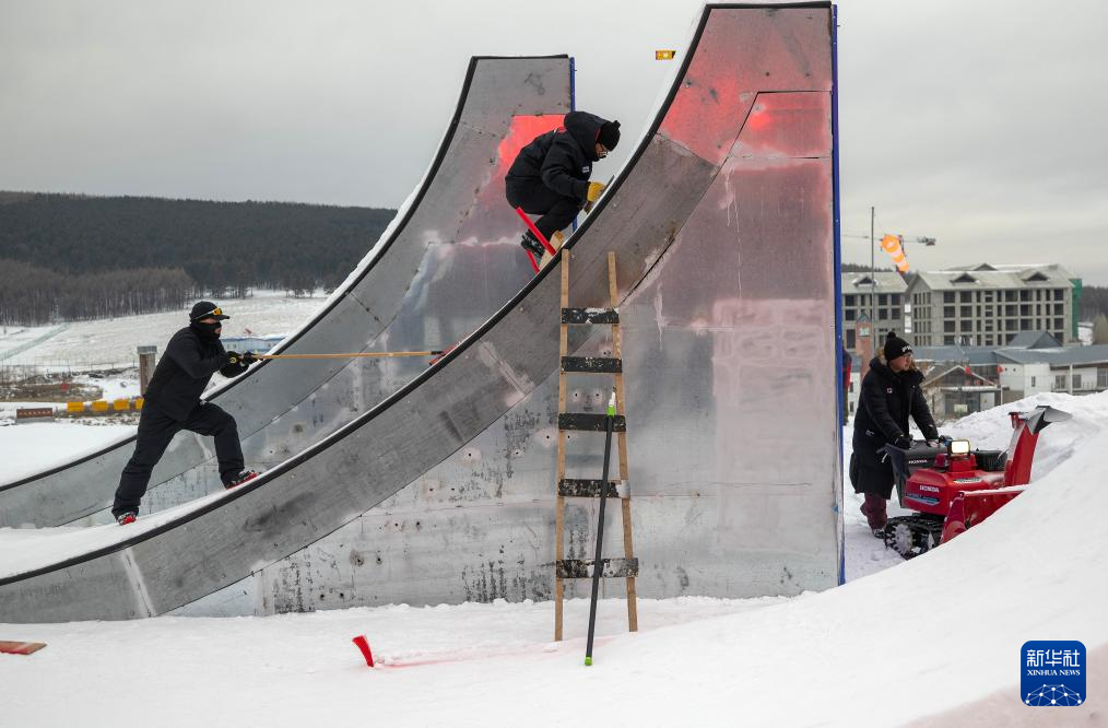 11月8日,自由式滑雪空中技巧国家集训队教练李科(左)、岳海涛(中)和闫冬在训练前平整、修葺场地。