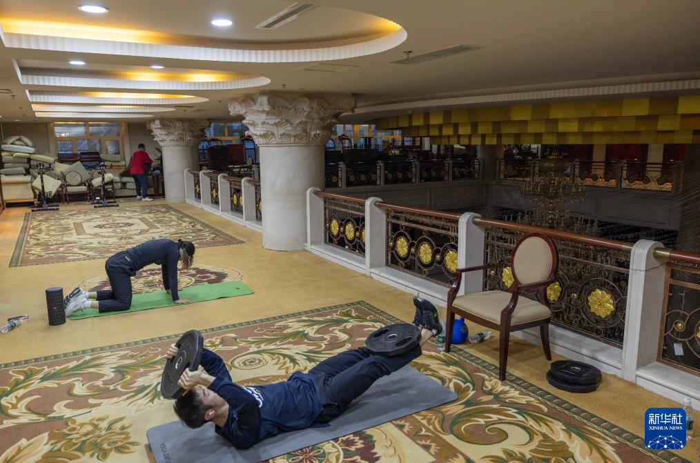 11月6日,在食堂改造而成的临时体能训练馆里,自由式滑雪空中技巧国家集训队队员在体能和力量训练开始前拉伸。