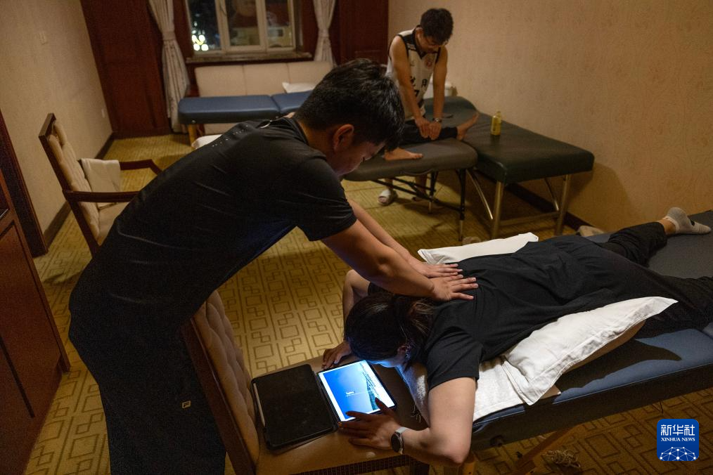 11月4日,在宾馆房间改造而成的临时按摩室里,自由式滑雪空中技巧国家集训队队员陈梅婷一边接受按摩,一边观看上午训练的视频。
