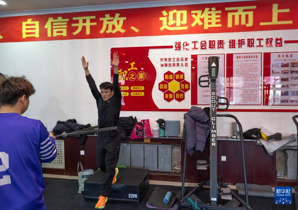 11月4日,在食堂改造而成的临时体能训练馆里,自由式滑雪空中技巧国家集训队队员王心迪在进行体能和力量训练。