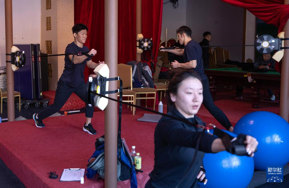 11月6日,在食堂改造而成的临时体能训练馆里,自由式滑雪空中技巧国家集训队队员邵琪(前)、孙佳旭(左一)和李天马(左二)在进行体能和力量训练。