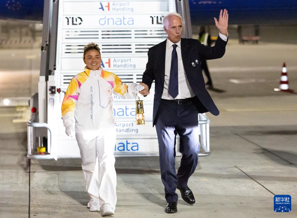 12月4日,在意大利罗马菲乌米奇诺机场,意大利网球奥运冠军保利尼(左)与米兰冬奥会组委会主席、意大利奥委会主席乔瓦尼·马拉戈携火种灯走下舷梯。