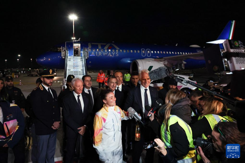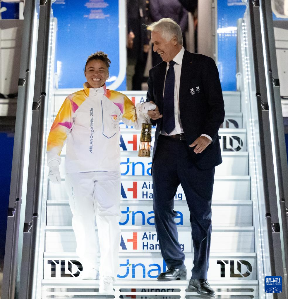 当地时间12月4日下午,搭载2026年米兰-科尔蒂纳冬奥会火种的航班从雅典抵达意大利罗马菲乌米奇诺机场。