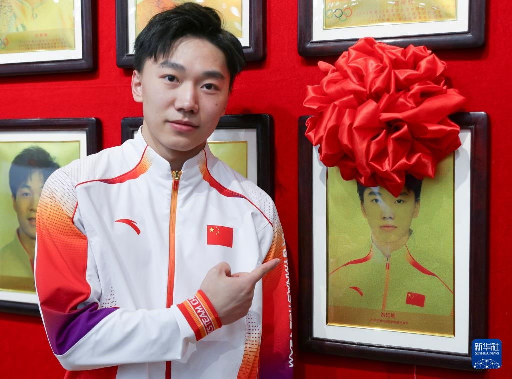 12月22日,中国体操队运动员洪延明在登榜仪式后与世界冠军榜上自己的照片合影。