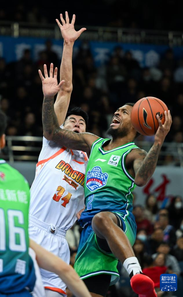 12月23日,天津先行者队球员詹姆斯(上)在比赛中上篮。