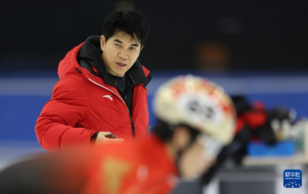 1月29日,中国短道速滑队教练全宰秀在训练中指导队员。