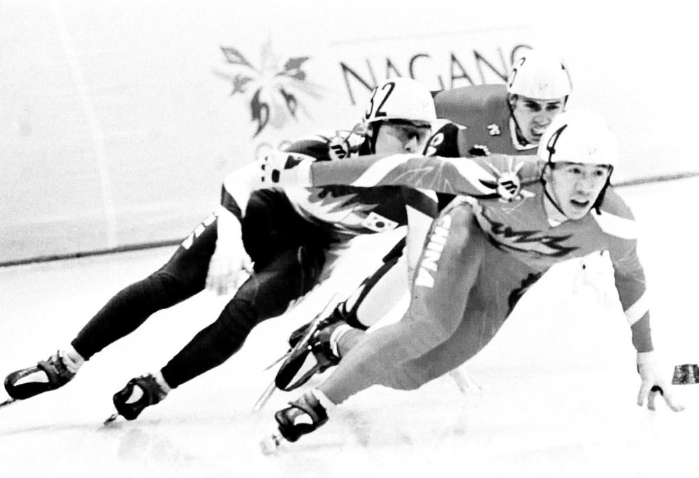 ↑1998年2月17日,李佳军(前)在长野冬奥会短道速滑男子1000米比赛中。
