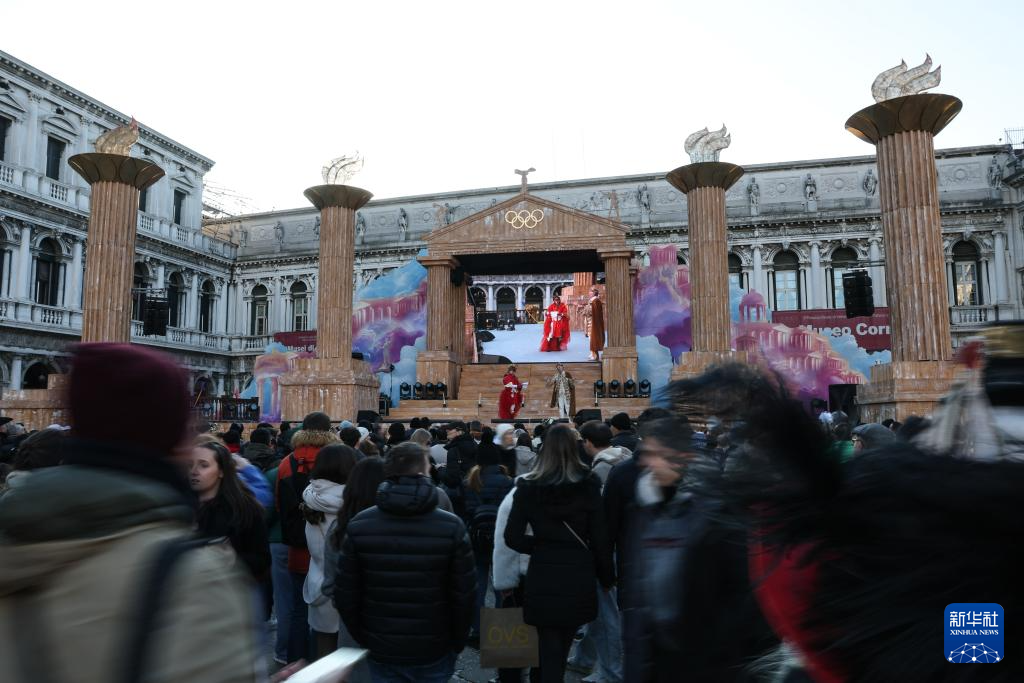 2月1日,在意大利威尼斯,人们在圣马可广场观看演出。狂欢节主舞台采用奥运主题造型。