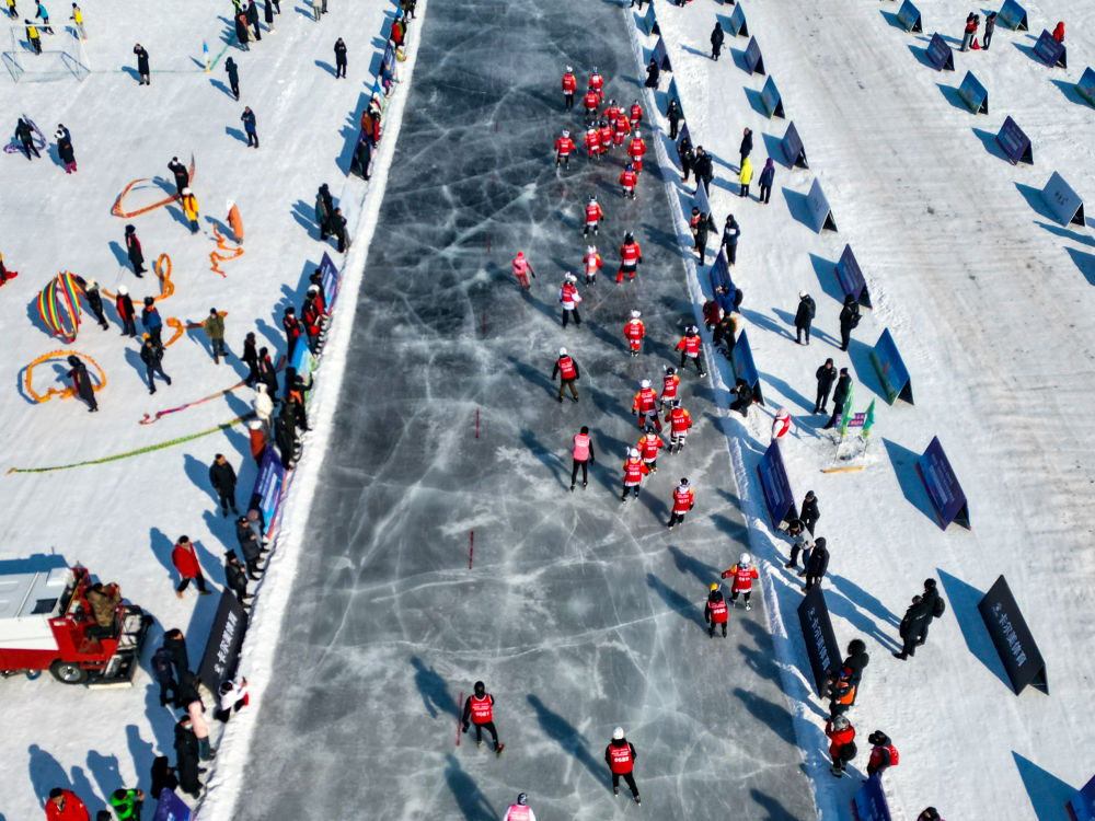 2024年1月30日,在吉林省白山市靖宇县举行的首届中国·吉林松花江滑冰马拉松挑战赛暨2024年全国全民健身大拜年主会场活动中,参赛者在滑冰马拉松挑战赛中(无人机照片)。新华社记者颜麟蕴摄