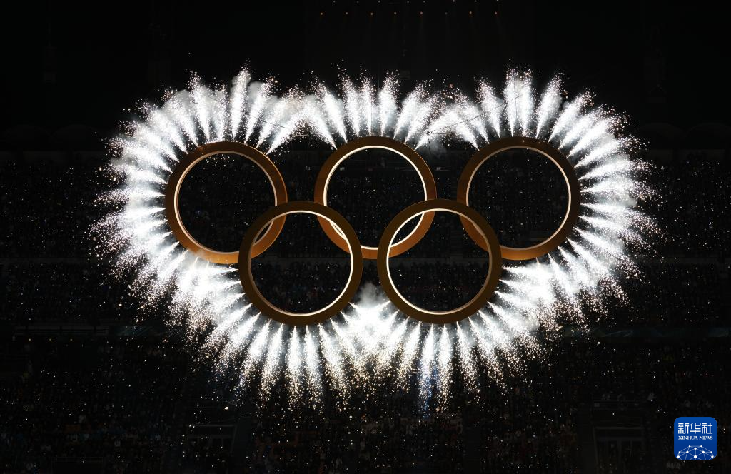 这是2月6日拍摄的开幕式现场的奥运五环。