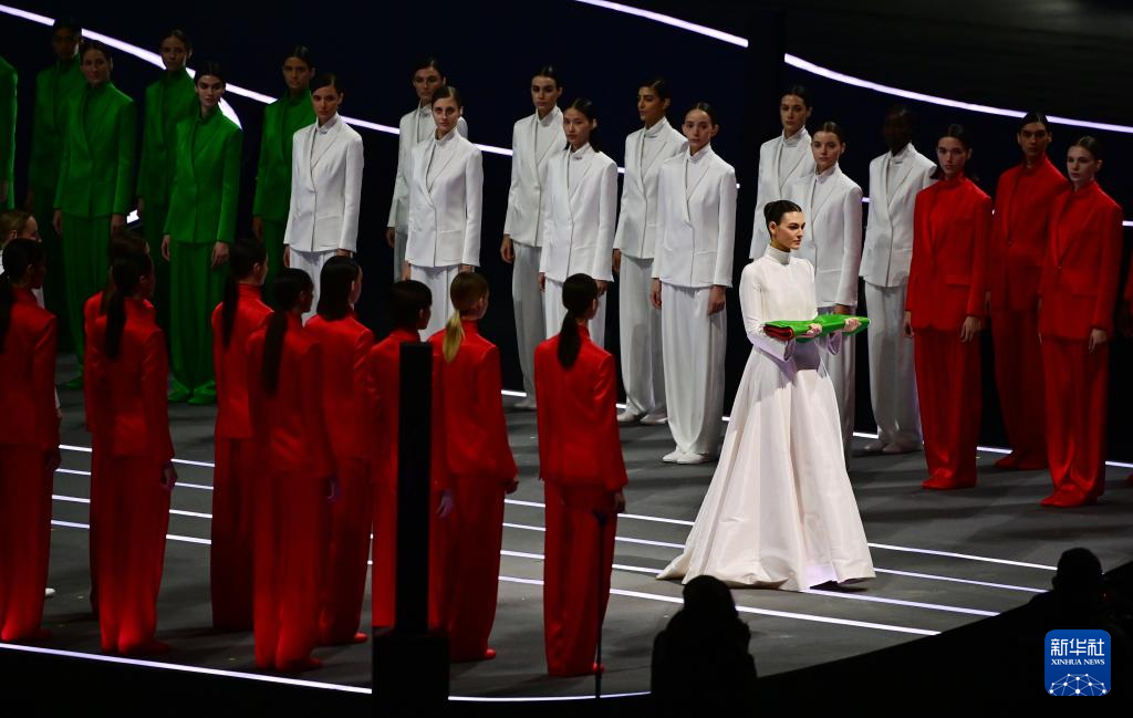 2月6日,模特维多利亚·切蕾蒂在开幕式上手捧意大利国旗入场。