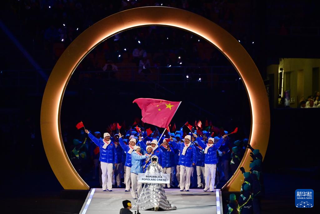 2月6日,中国体育代表团成员在意大利普雷达佐参加入场仪式。