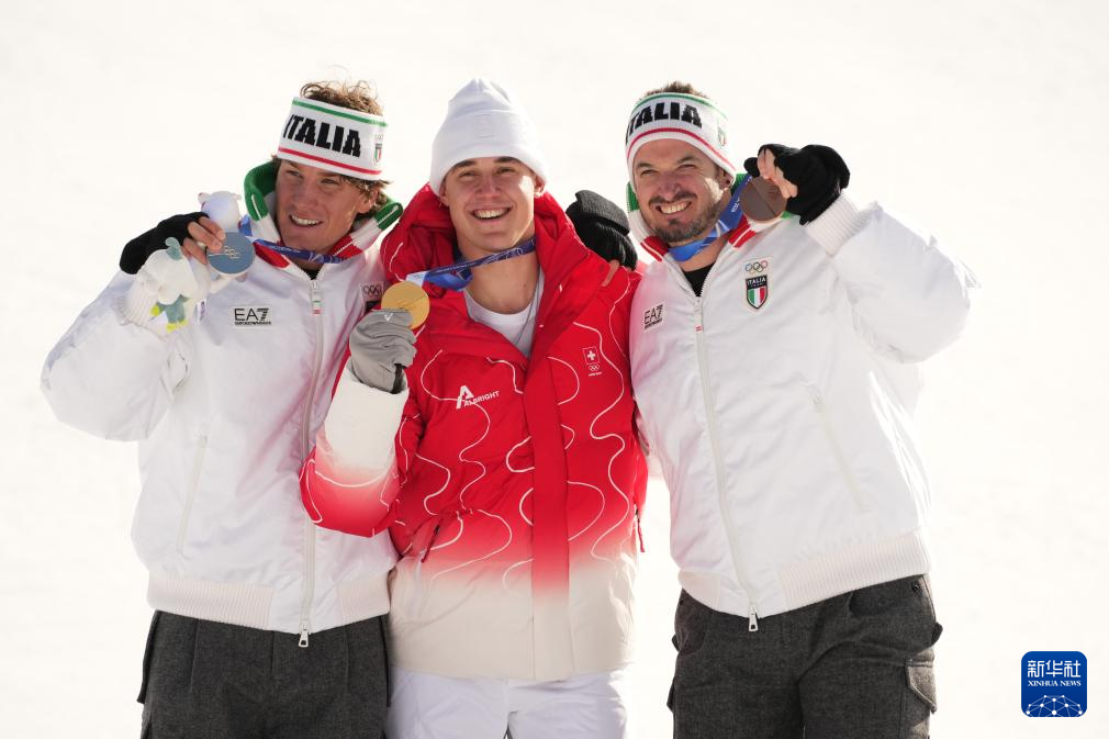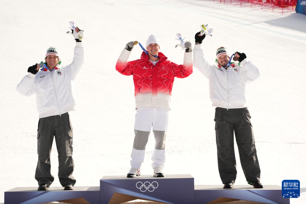 2月7日,冠军瑞士选手冯阿尔曼(中)、亚军意大利选手弗兰佐尼(左)、季军意大利选手帕里斯在颁奖仪式上。