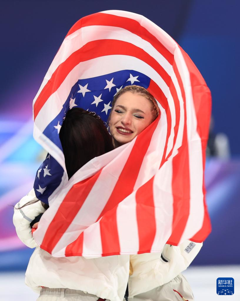 2月8日,美国队组合埃莉·甘(左)/奥谢在团体赛双人滑自由滑比赛中。