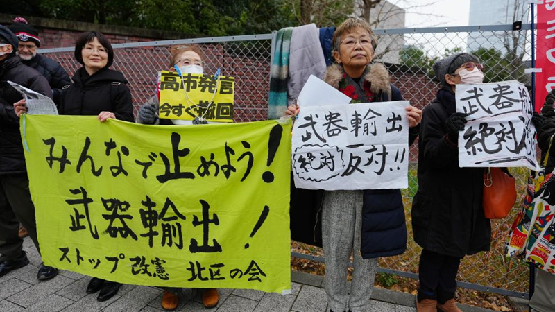 日本民眾就執(zhí)政聯(lián)盟放寬武器出口限制的動(dòng)向舉行抗議集會(huì)